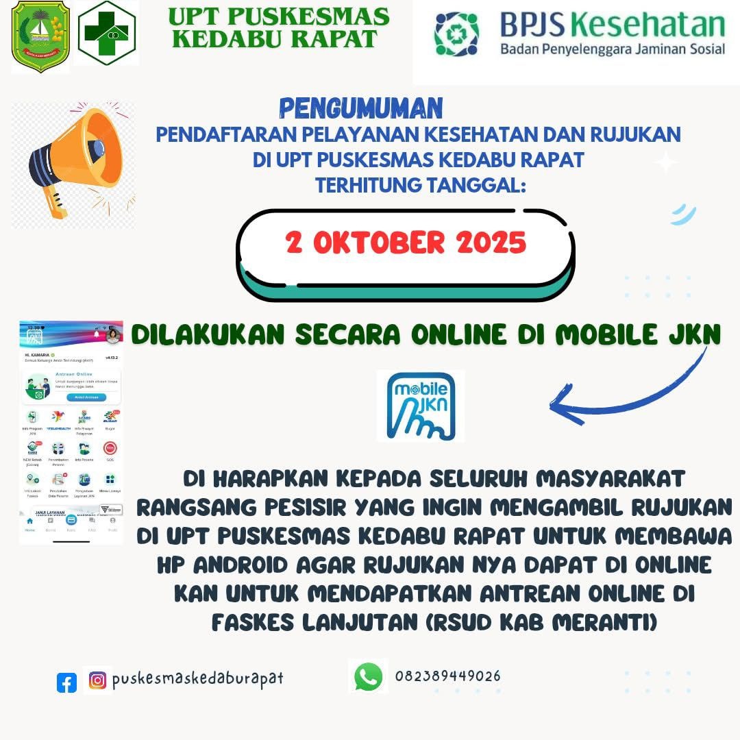 Di Harapkan Kepada Seluruh Masyarakat Rangsang Pesisir Yang Ingin Mengambil Rujukan Di UPT Puskesmas Kedabu Rapat Untuk Membawa Hp Android Agar Rujukan Nya Dapat Di Online Kan Untuk Mendapatkan Antrean Online Di Faskes Lanjutan (RSUD Kab Meranti)